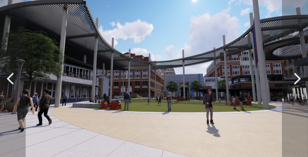 The greenspace will become oval-shaped, featuring a curved canopy and a signature water fountain. A large LED television screen will be installed to broadcast live events and social media alerts.
